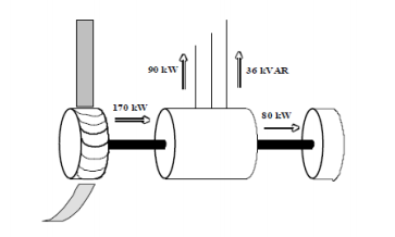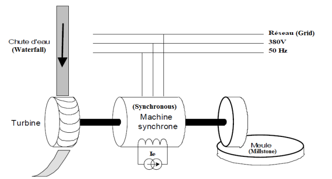 A mill (“un moulin”) for producing flour (“farine”) is driven by a hydraulic turbine and a synchronous machine connected to the grid. Turbine, synchronous machine and millstone are in the same axis.The power required for proper operation of the mill is 80 kW. The mechanical power supplied by the turbine varies between 0 and 170 kW depending on the water flow in the feed line. The figure below gives an overview of the system: