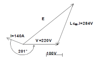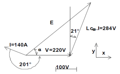 {E.sinα = Lcω.Icos(21°), E.cosα = V + Lcω.Isin(21°) . En élevant au carré et en sommant les deux équations, on obtient: E2 = V2 + (Lcω.I)2 + 2×Lcω.I.sin(21°) = 2202 + 2842 +220×284×sin(21°) ⇒ E = 416V