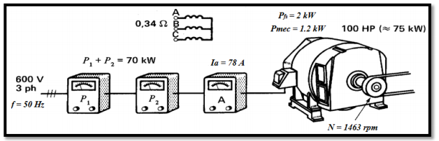 A 600V line powers a three-phase induction motor with a nominal power of 100 hp (≈ 75 kW). Two wattmeters placed in the line wires indicate a total power of Pa = 70kW and an amperemeter indicates a line current of  Ia = 78A. Accurate measurements indicate a speed of rotation of  N = 1463 rpm. In addition, the following information is provided: