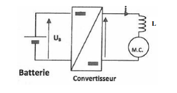 B- Le dispositif électronique. Le moteur est alimenté par l’intermédiaire d’un convertisseur continu-continu. L’énergie électrique est stockée dans une batterie placée à l’arrière du véhicule. Le schéma de principe du circuit de puissance est le suivant :
