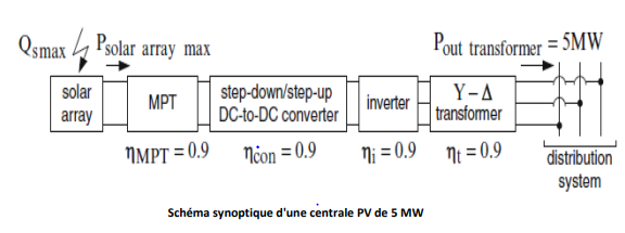 b) Si  chacun  des  composants,  régulateur  de  puissance  maximale (MPT), hacheur élévateur/abaisseur, onduleur triphasé et transformateur, à un Rendement η=90%  quelle est la puissance maximale requise du générateur solaire(Psolar-array-max) pour une puissance à la sortie du transformateur Pout-transformateur=5MW ?