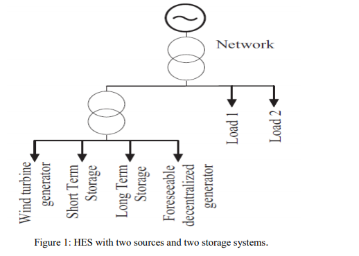 Let’s consider a Hybrid Energy System (HES) composed of two different sources and storage systems: a wind generator (WTG), short and long term storage systems and a foreseeable generator (FDG) like micro gas turbine or diesel generator (figure 1). This HES is connected to a power grid.