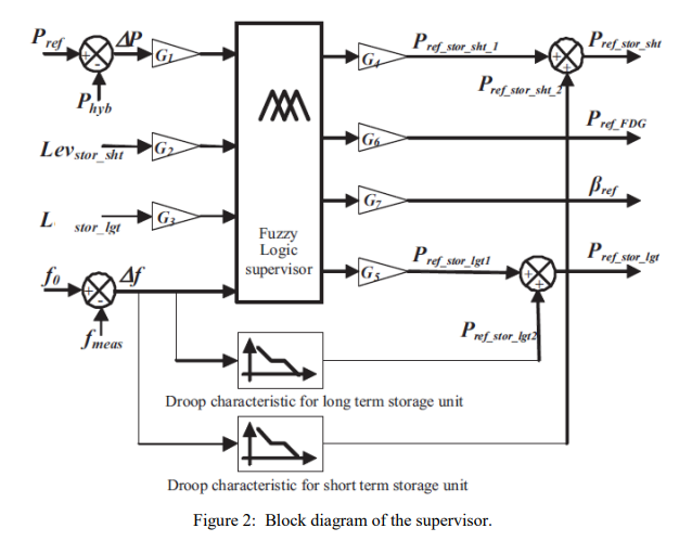 The HES is managed with a fuzzy logic supervisor as shown in the following block diagram: (G1, G2, and G5 are normalization gains βref; wind generator pitch angle reference).