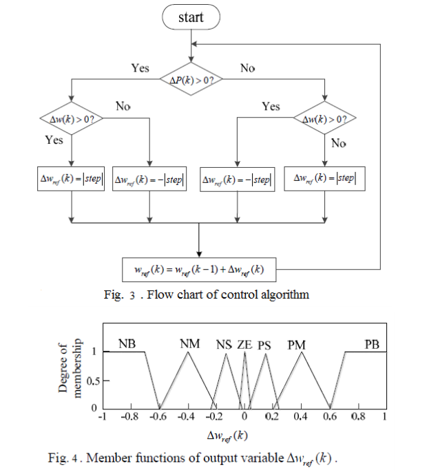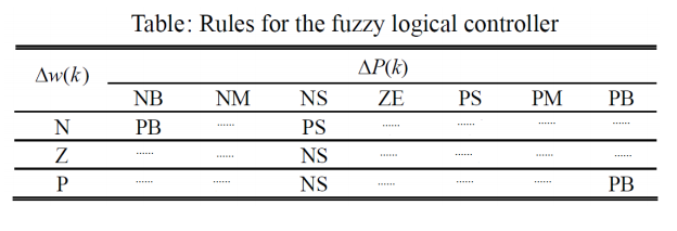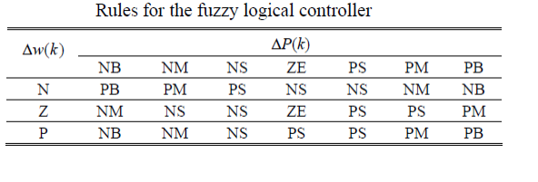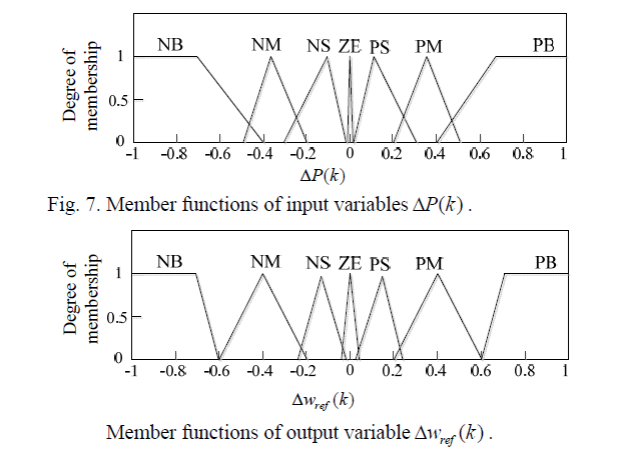 2) The set of fuzzy logical controller is described as follows: The input variables are ΔP(k) and Δw(k), while the output variable is  Δwref(k). ΔP(k) and Δw(k) can be obtained by:      ΔP(k)=P(k) -P(k-1)  and   Δw(k) = w(k) – w(k-1).