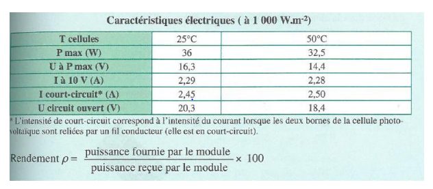 Les caractéristiques d’un module photovoltaïque sont données dans le tableau ci-dessous, lorsque le module reçoit une puissance rayonnante de 1000W sur 1m2 de sur de module .