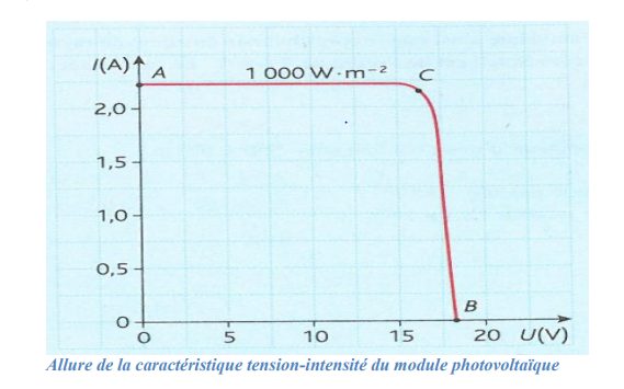 1) Donner l’allure de la caractéristique tension-intensité (tension en abscisse et intensité en ordonnée) de ce module photovoltaïque, à 50°C, pour une puissance rayonnante reçue de 1000W.m-2. On placera: