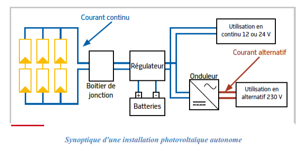 4) Ce panneau est installé en site isolé dans un système autonome. Faites le schéma synoptique de l’installation.